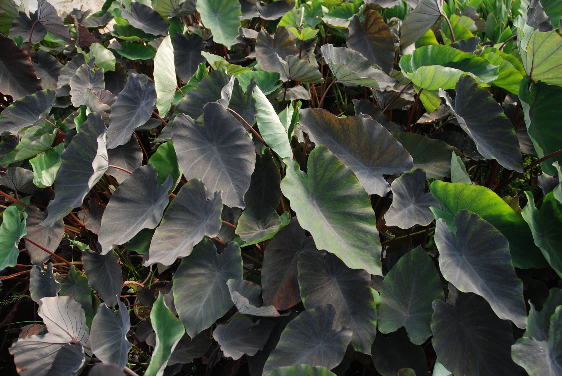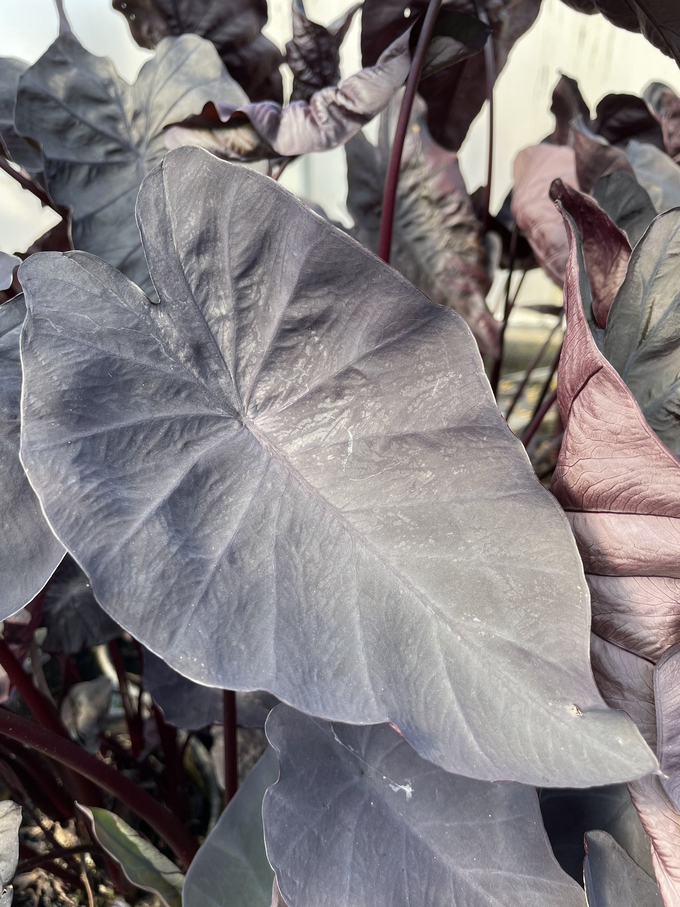 Black Magic 'Elephant ear' is unbelievable with 2' long solid purple-black leaves that show a slight dusty look. Makes a dramatic statement for your pond. Grows fast if well watered and in a bright location. Full sun to part shade. Full sun brings out the best leaf color. Up to 6' tall, Zone 7 (although known to winter over in Zone 6)