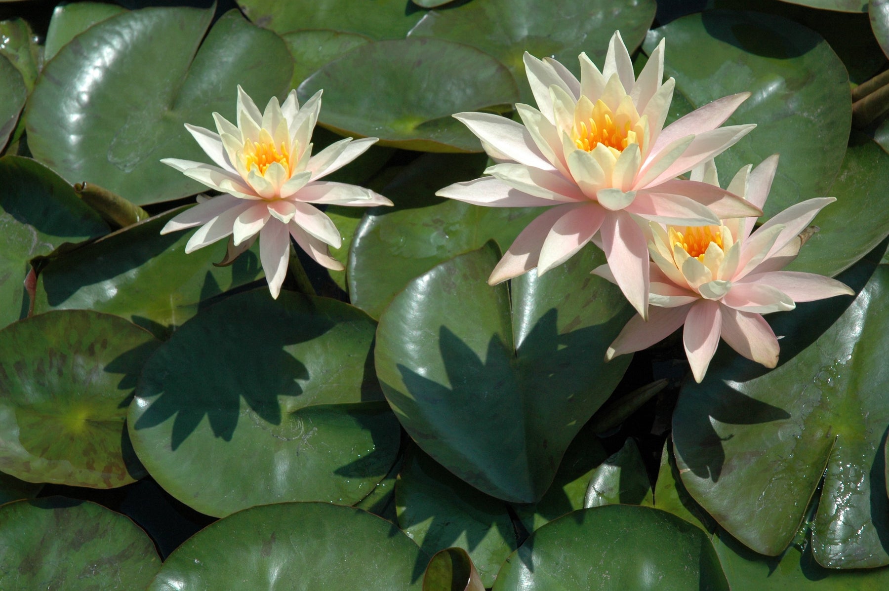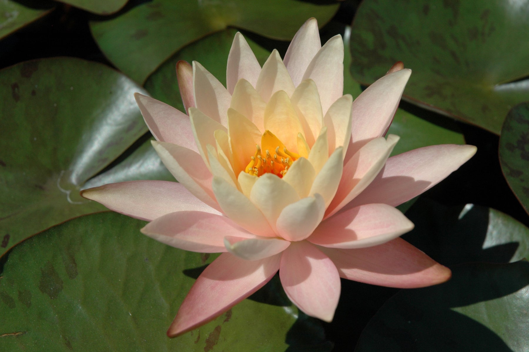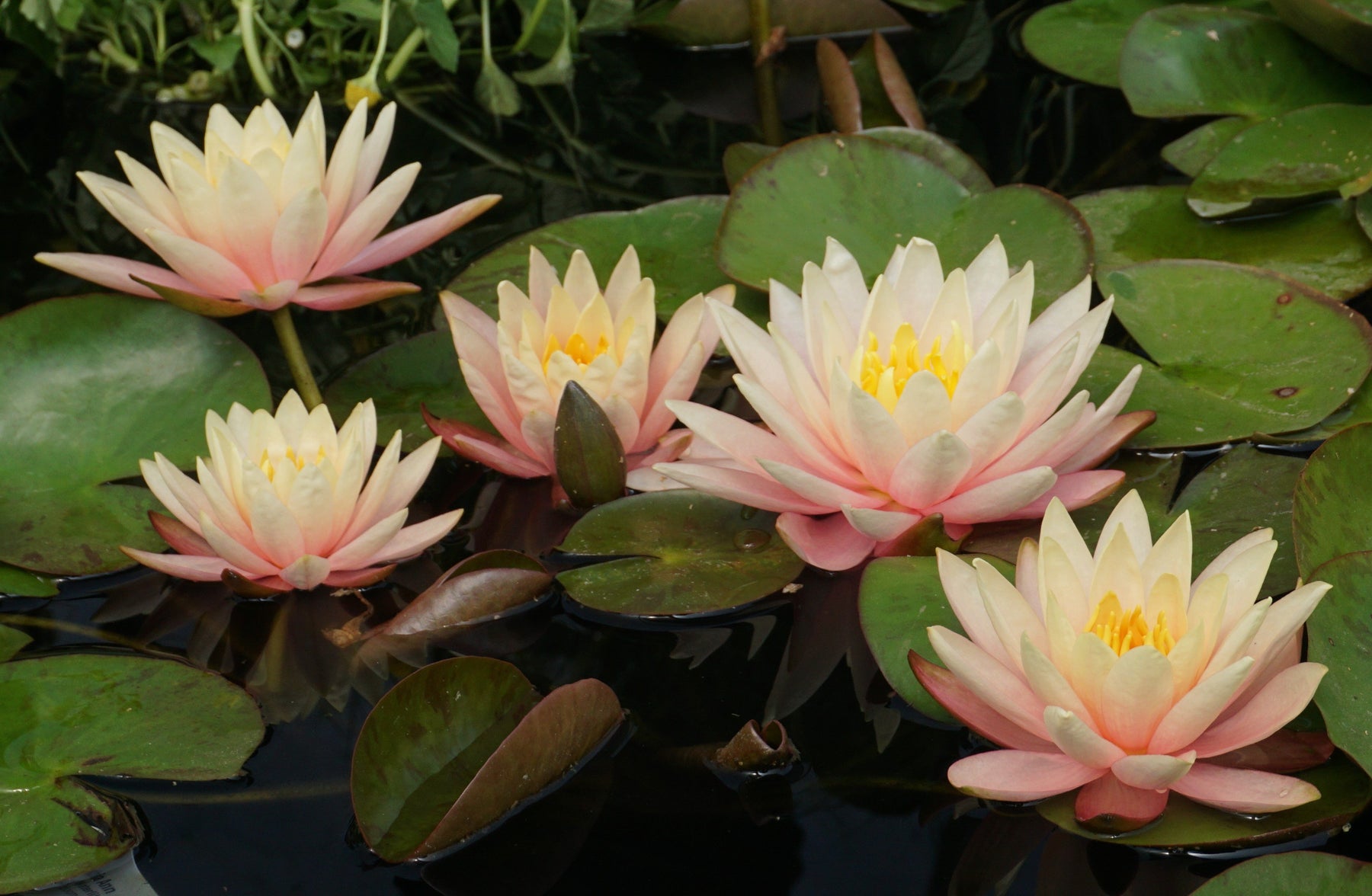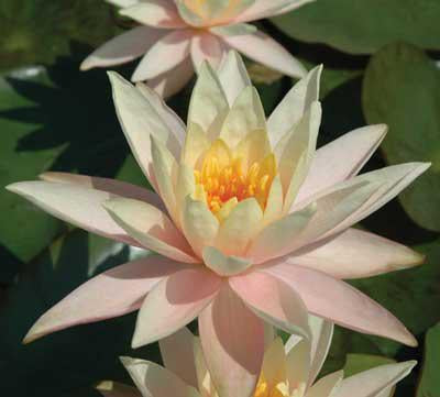 Abundant apricot-peach blooms on one of the smallest changeable water lilies. Blooms 4"-5", flowers rise 2'-3' above the lightly mottled leaves show off this medium size lily, Blooms late spring-fall, Full sun, Zone 4-10